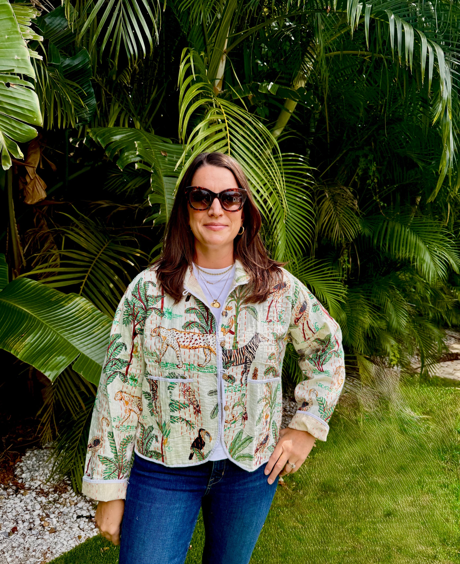 She’s a playful addition to your wardrobe- made from beautifully stitched fabric, this jacket showcases intricate designs that tell a story of traditional craftsmanship. The relaxed fit hits just above the waist, making it perfect for layering over your favorite essentials.