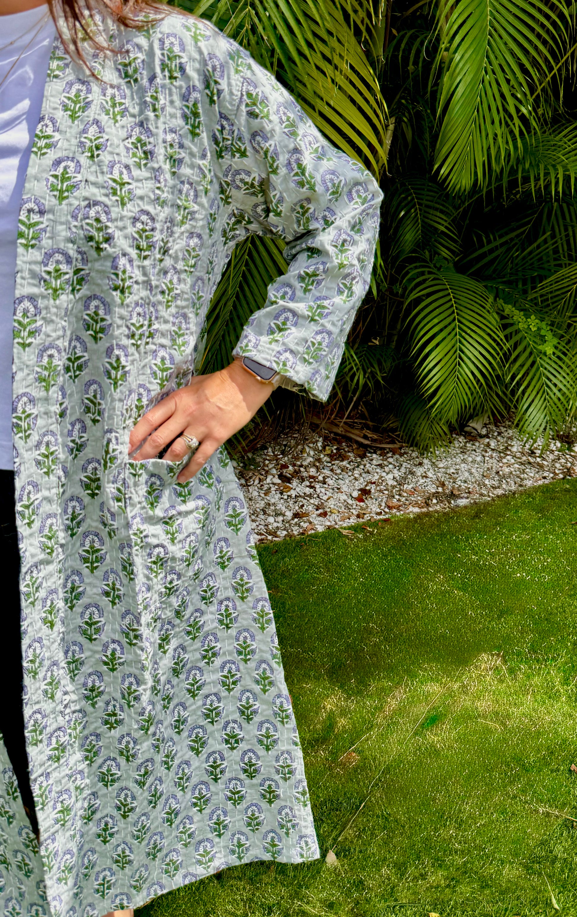 Cotton Kantha duster — lightweight, breathable, and stitched with soul. Each piece is one-of-a-kind, handcrafted from layered cotton and detailed with traditional Kantha stitching.